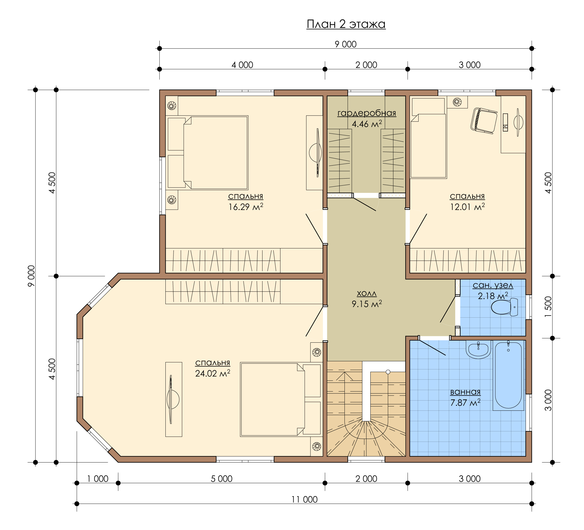 Для любителей оригинального стиляВ двухэтажном доме «Себастьян» четыре спальные комнаты и гардеробная. Войти внутрь можно двумя способами – через Г-образную террасу, которая ведет к тамбуру, или через крыльцо помещения котельной. На каждом этаже расположен санузел.