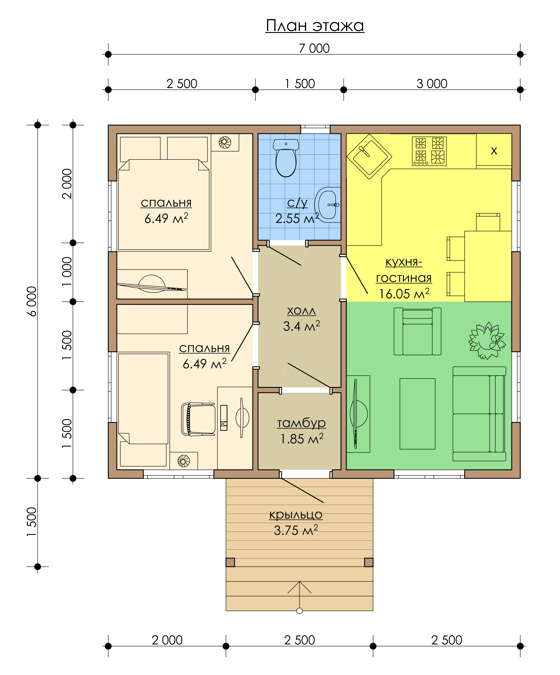 Одноэтажный дом для загородной жизниПроект «Техас» можно использовать как в качестве дачи, так и в качестве дома для постоянного проживания небольшой семьи. В одноэтажном доме есть все необходимое для комфортной жизни – две спальные комнаты, санузел и просторная кухня-гостиная.